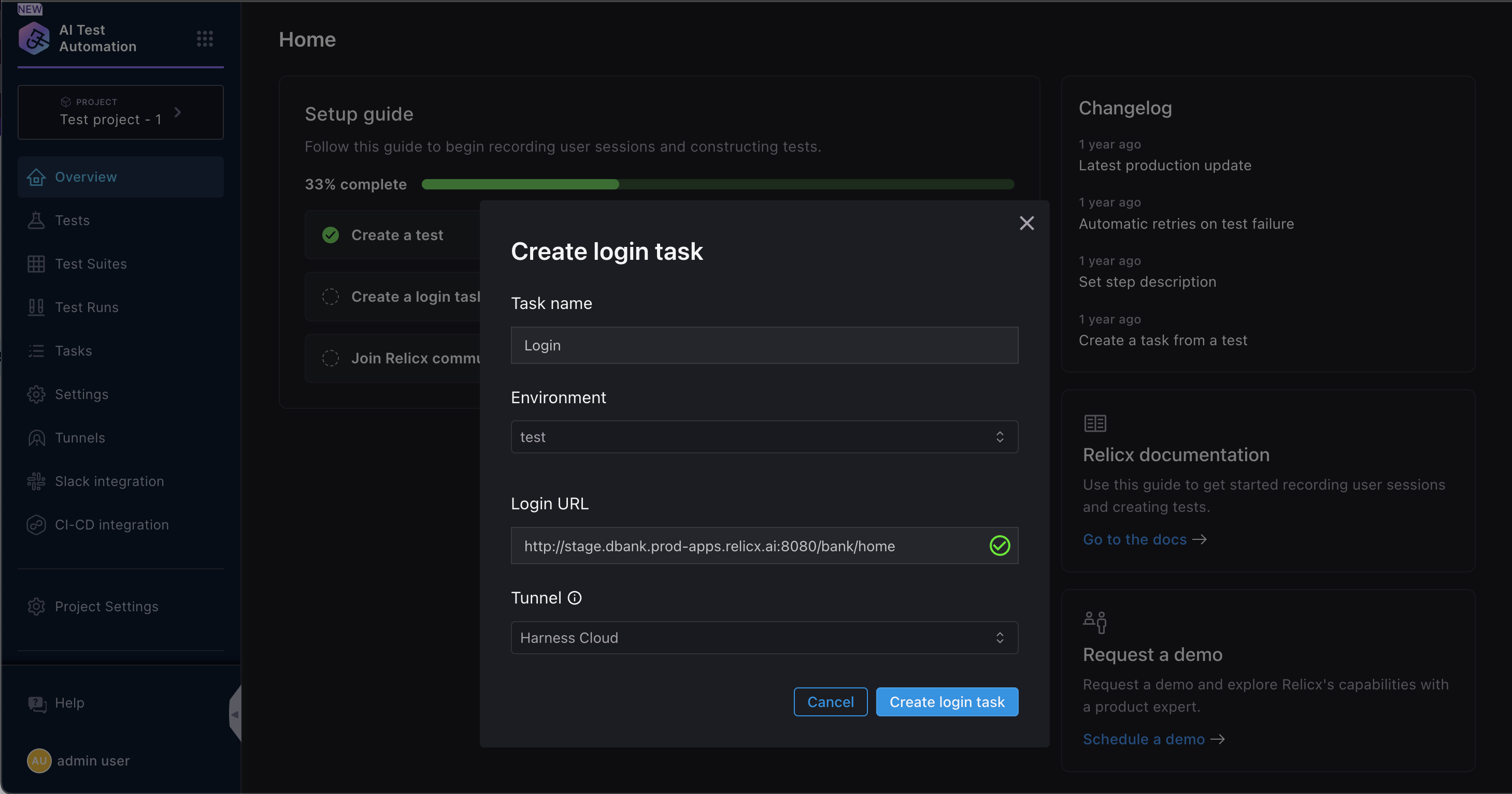 Once the Create a login task button is clicked then you will be present with the following modal, where you will have to enter a few details. Keep in mind this is a one time creation and the experience is very similar to creating a test.