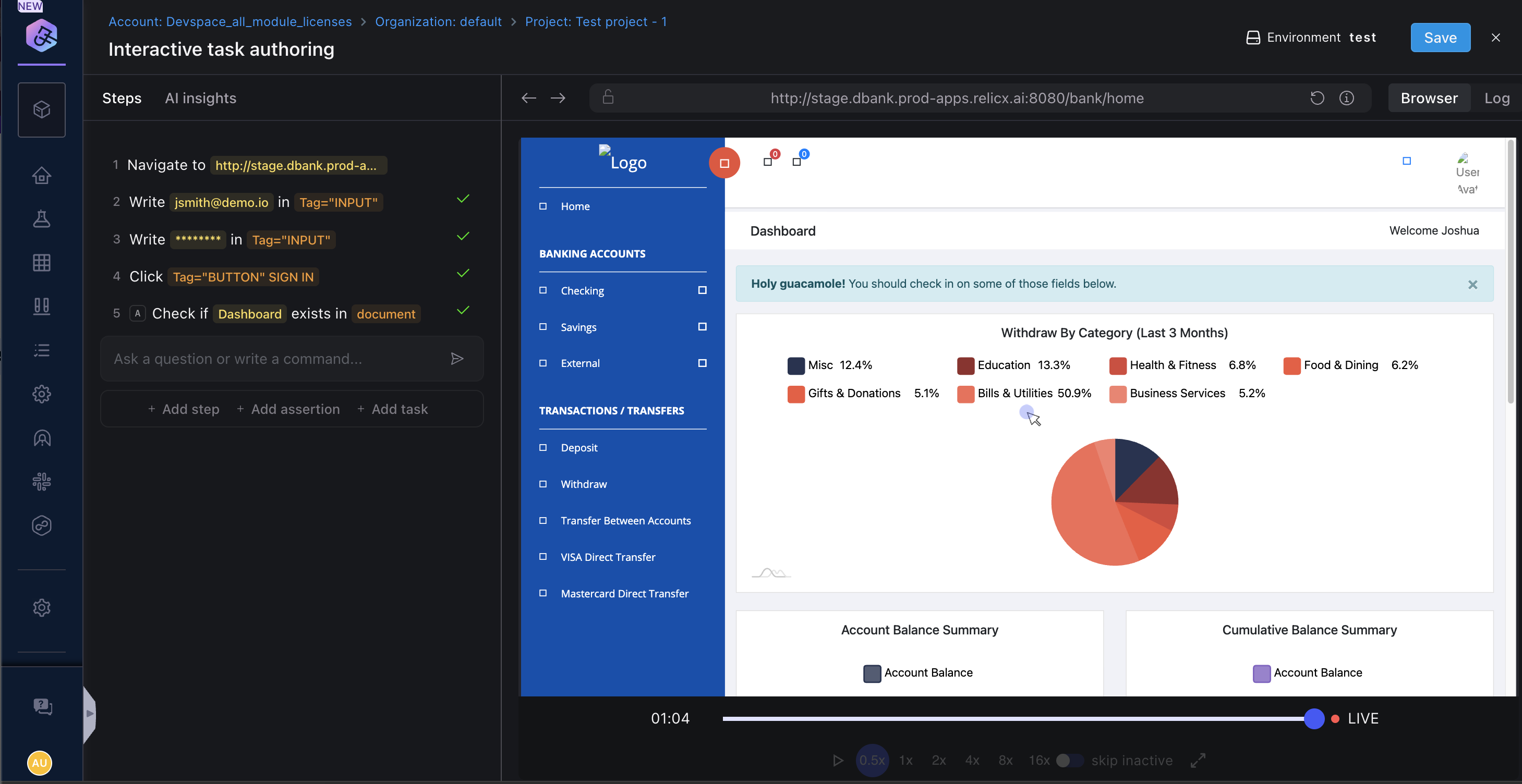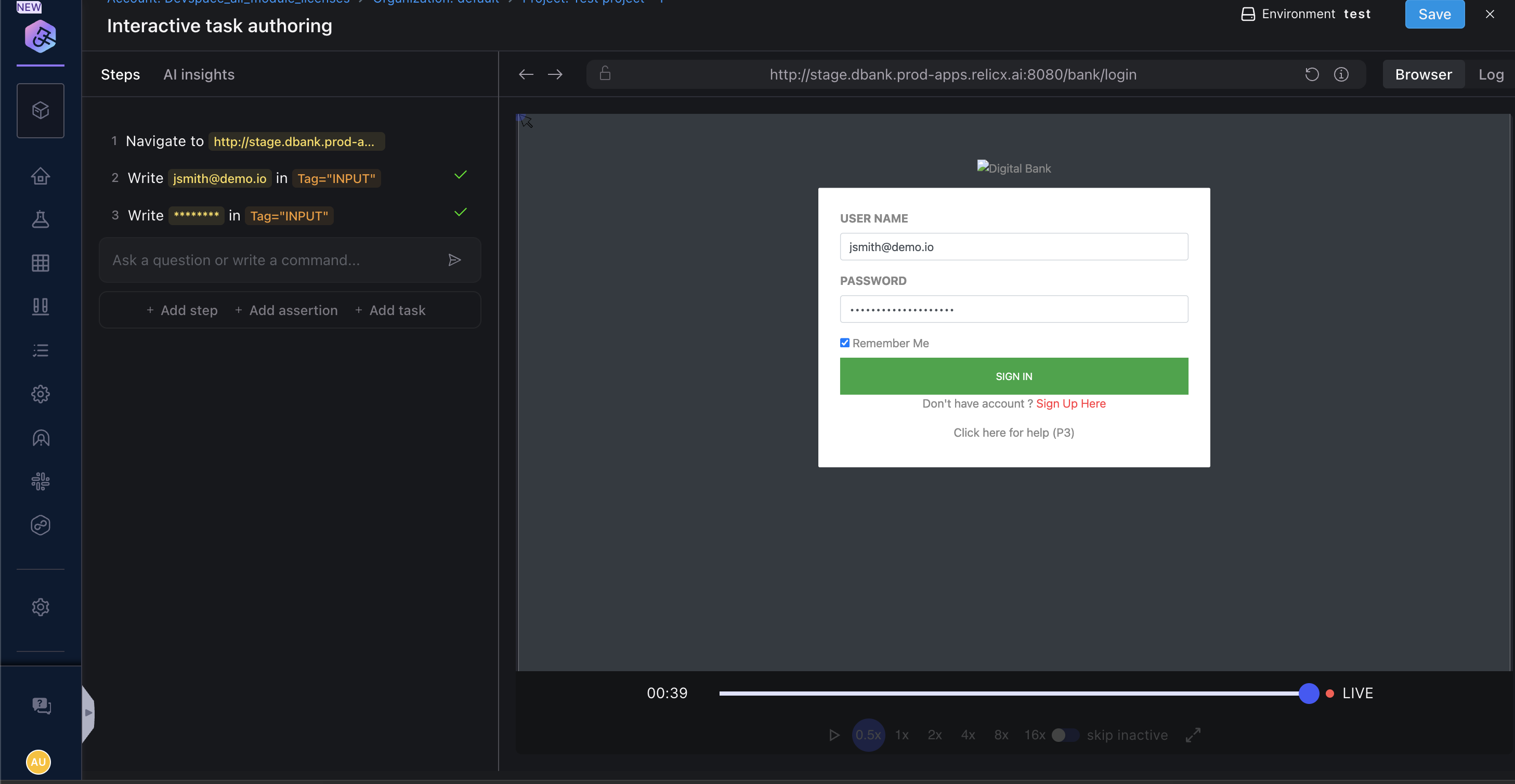 If your application requires authentication, you may wonder how can you avoid adding the login steps into your test every time. Harness AI Test Automation provides the ability to add a login task that is automatically called when a test is either created or executed. You just need to create it once and add your login credentials;