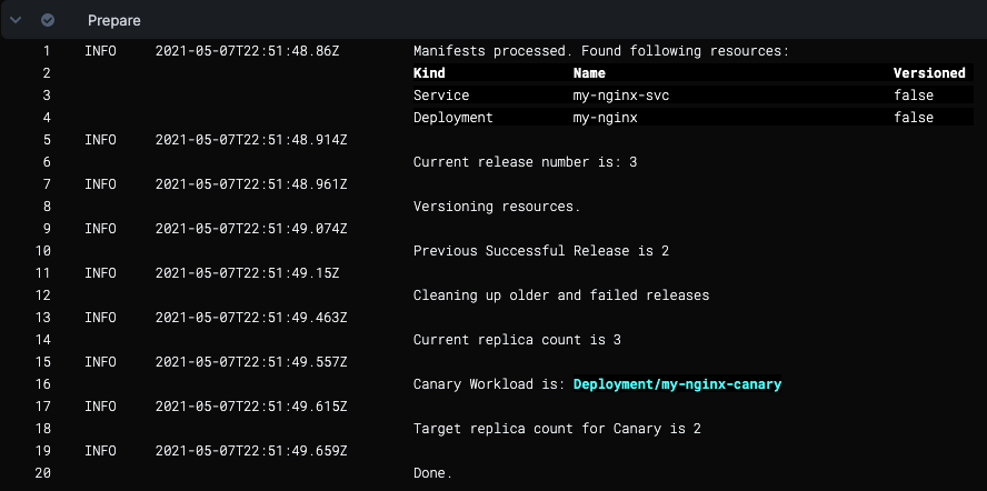 As you can see, Harness appends the name with -canary, my-nginx-canary. This is to identify Canary Deployment step workloads in your cluster.