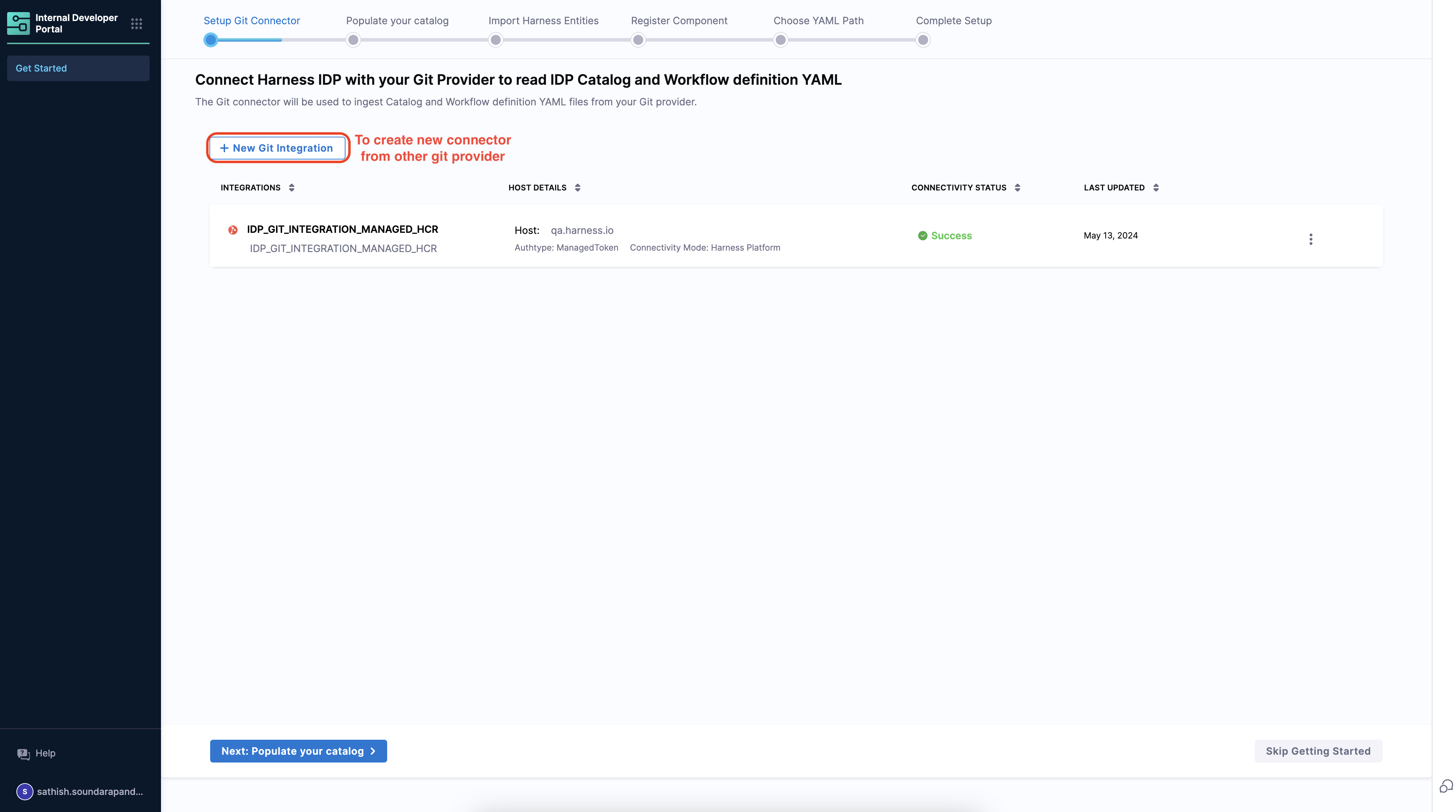 1. You land on the IDP module by navigating from the sidebar after logging into your Harness account. We strongly recommend users to follow the onboarding guide selecting the Get Started, for a seamless onboarding resulting in a catalog with software components.