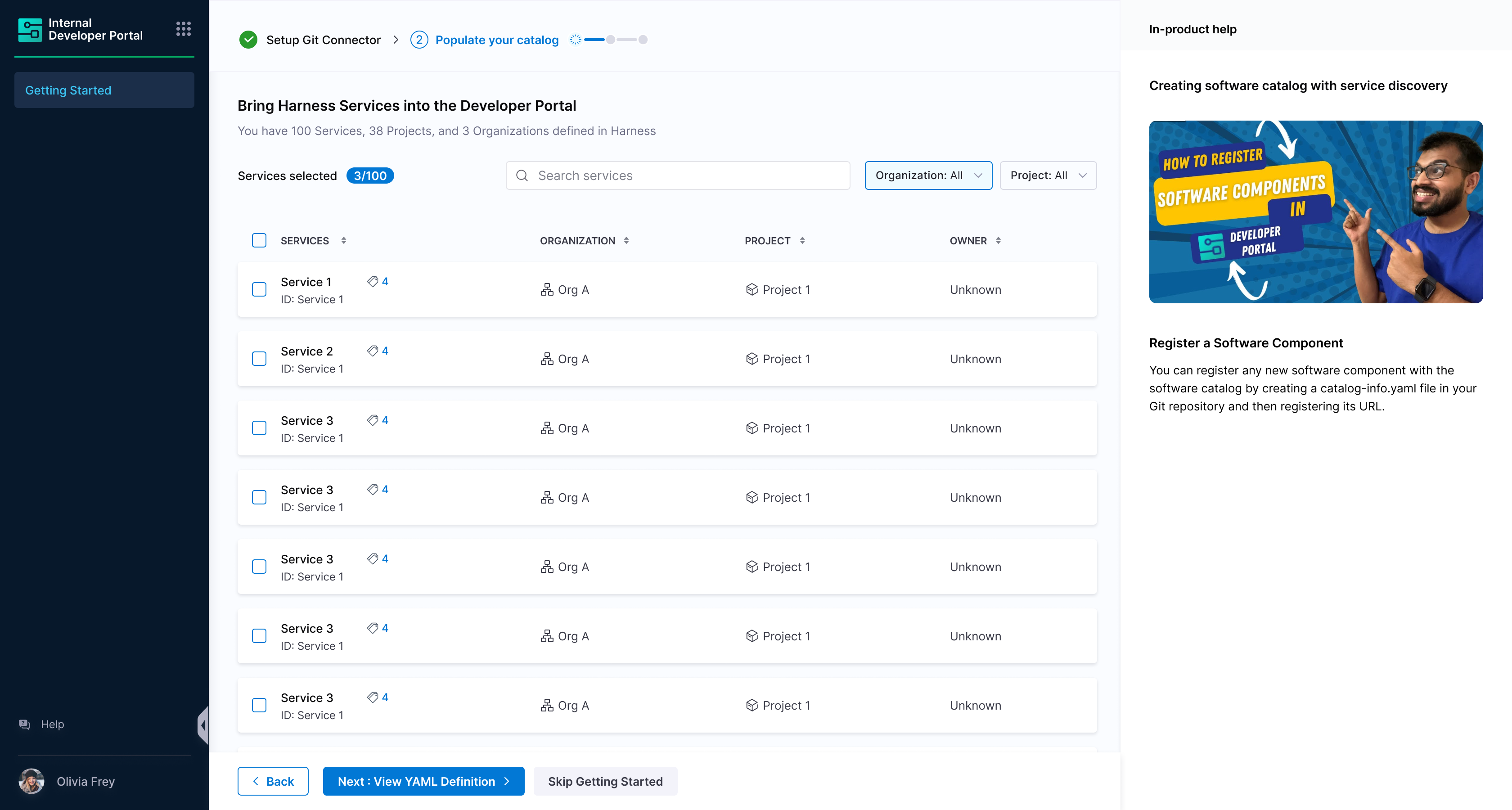 Users will now have option to onboard existing Harness services into IDP, or start with a sample service.