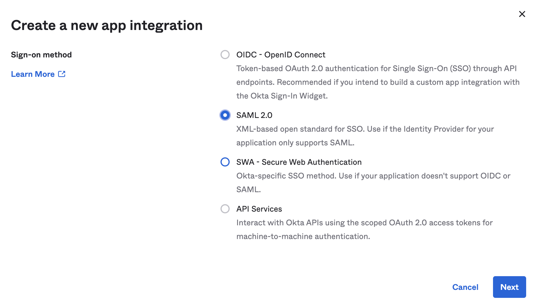 Select SAML 2.0, then select Next.