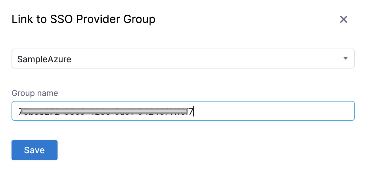 In the Link to SSO Provider Group dialog, in Search SSO Settings, select the SAML SSO Provider you have set up.