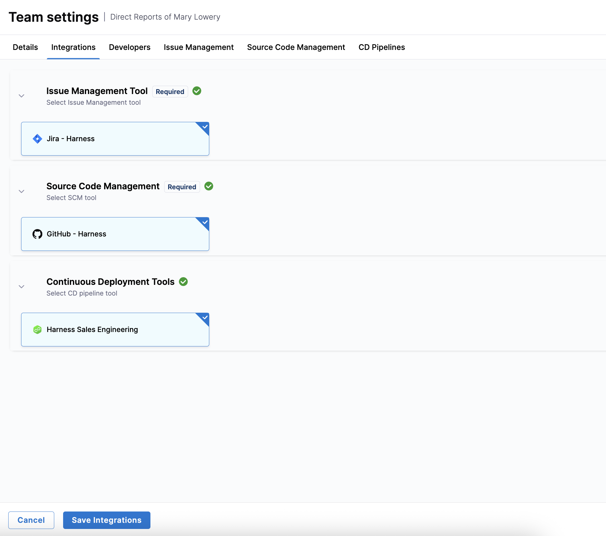 Select available integrations for this team on the Integrations tab and click Save Integrations.