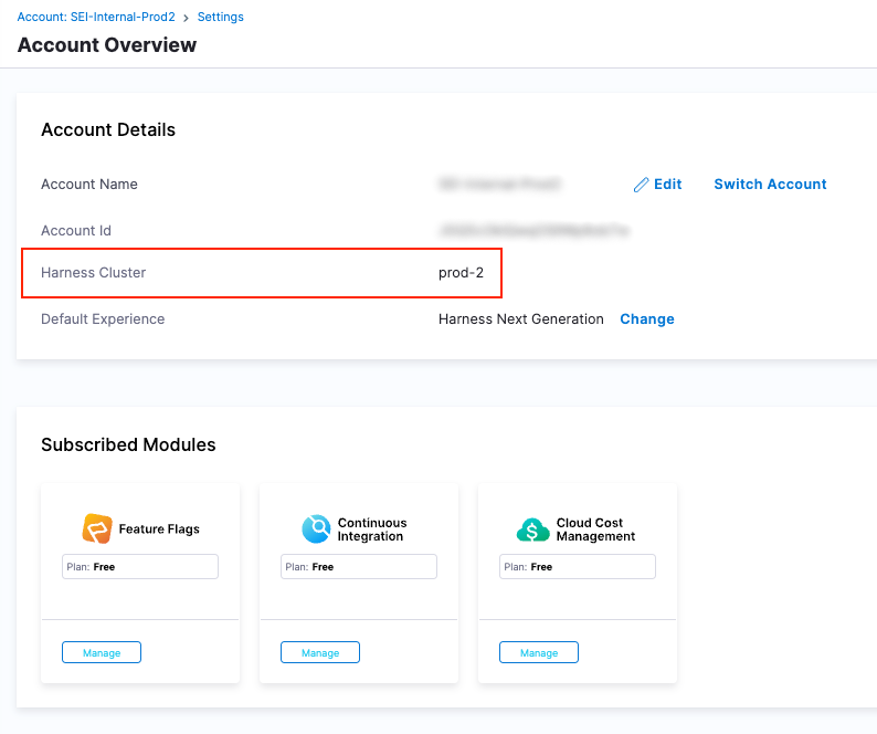 To get an overview of your Harness account, go to Account Settings. Under General, select Account Details to open the Account Overview page. The Account Details section enables you to view your account information and set your default experience.