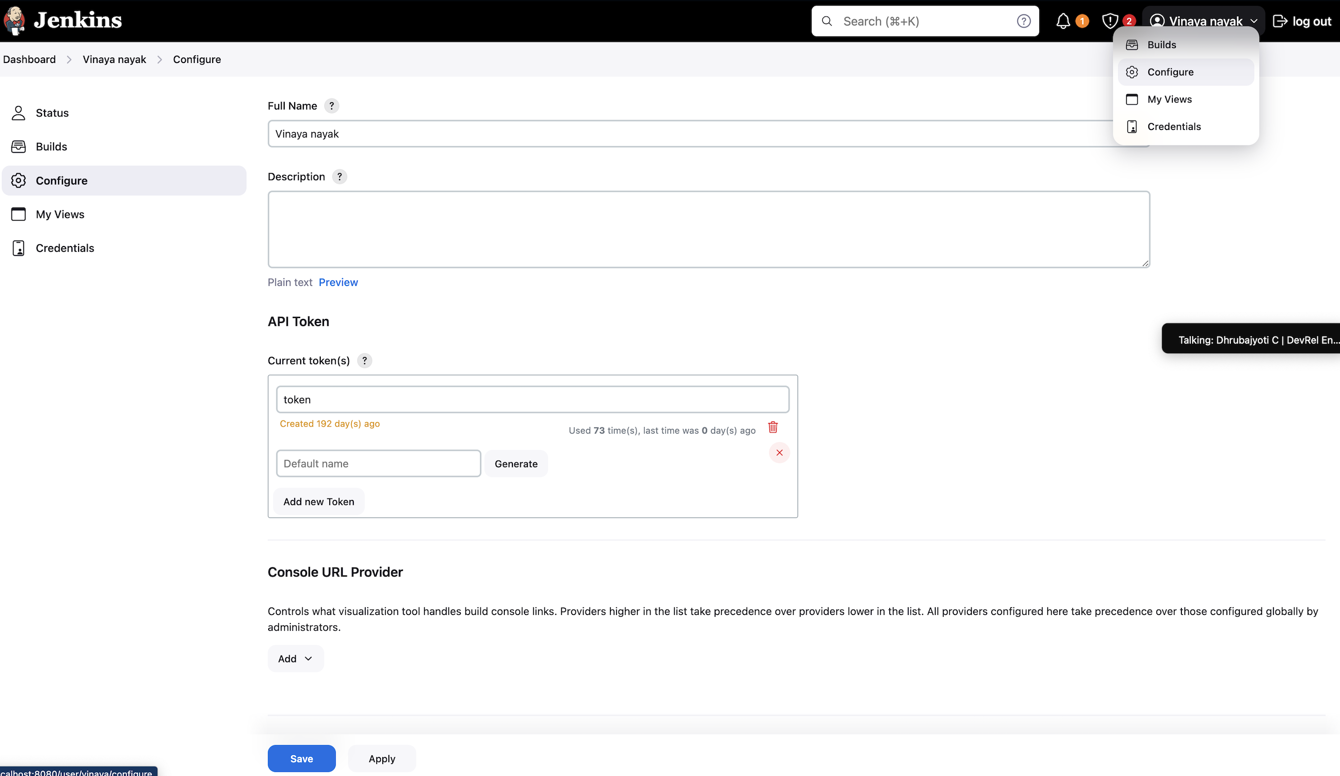 - In the Jenkins banner frame, click your user name to open the user menu.
