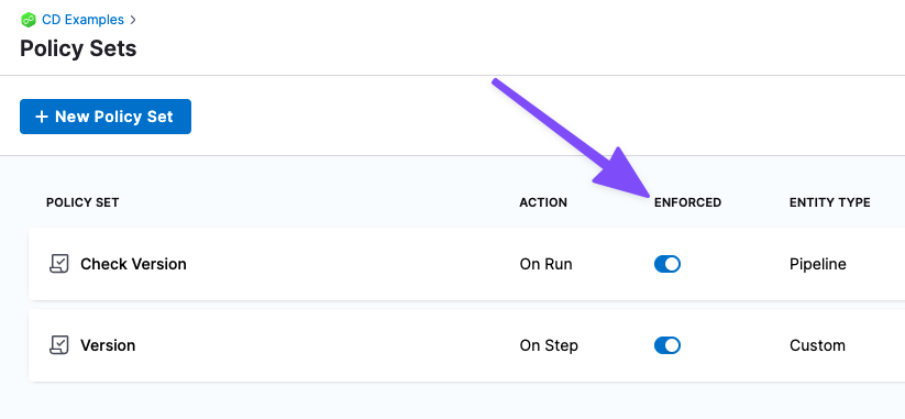 Contact your Harness account administrator to resolve the issue. If the policy set has an error, you can disable it by locating the policy set and turning off the Enforced toggle.